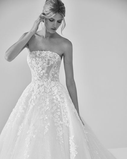 Ses collections s'étendent des coupes empire classiques aux robes sirène moulantes, avec des décolletés en cœur, de magnifiques dos en V, d'élégants cols bateau et de magnifiques corsages parsemés de dentelle Chantilly et d'appliqués perlés.